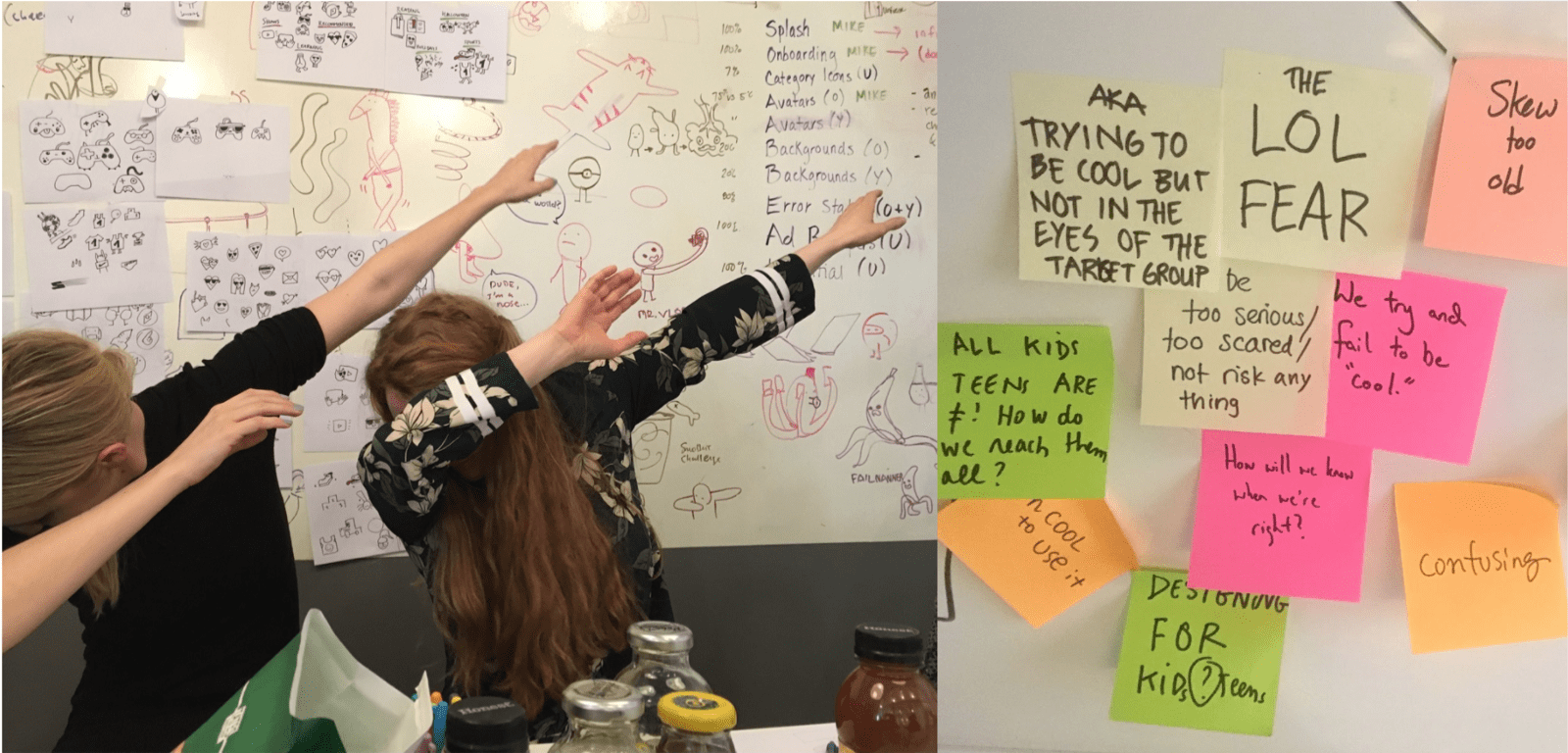 Getting into the young mindset at our NYC office (left). Google Sprint exercise — dreams vs. fears (right).