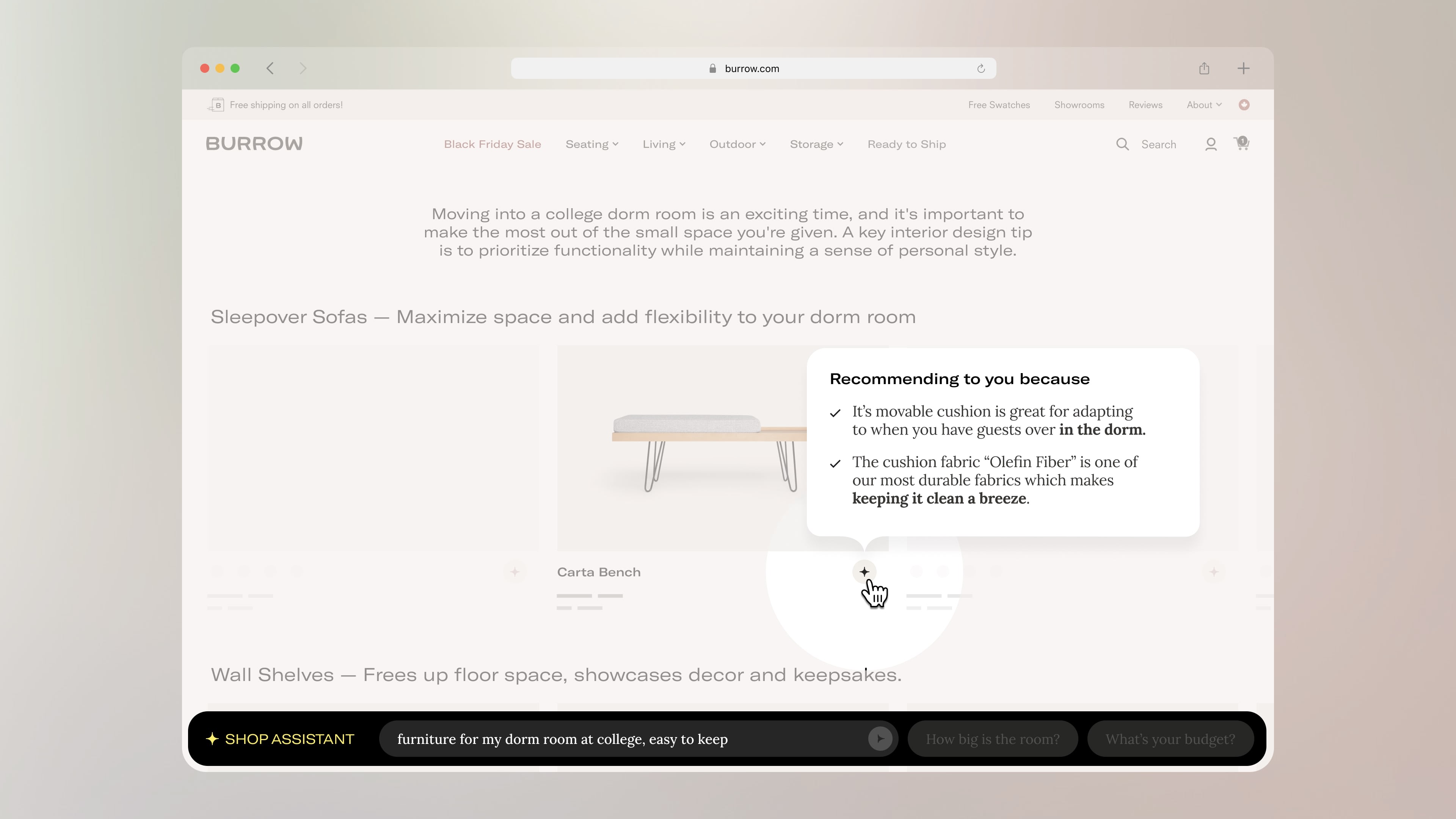 The AI could integrate product suggestions seamlessly into this advice. For a company like Burrow, this means showing furniture options that fit the recommendations. This all happens within a user interface designed to feel like a natural extension of reading, with product suggestions woven into the narrative.