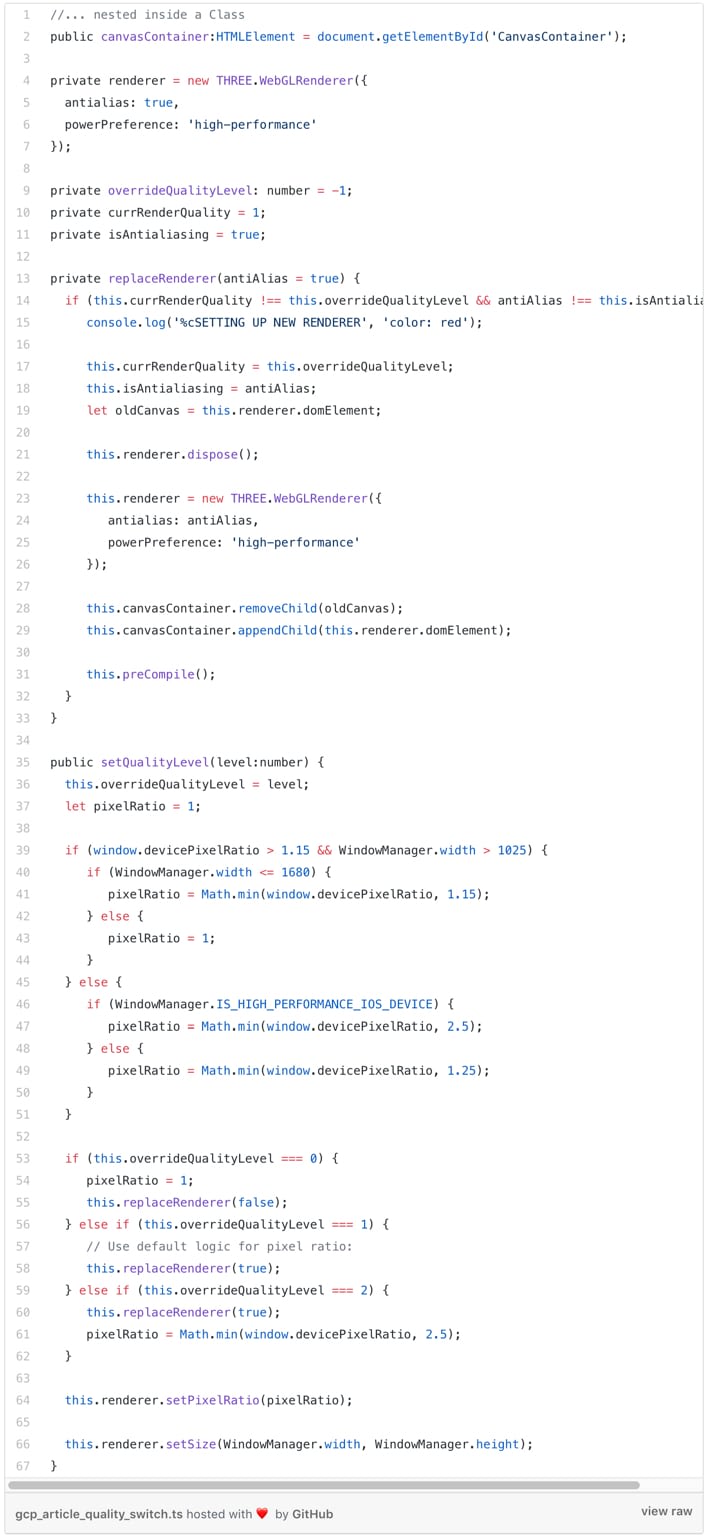 To keep it simple and to avoid adding a ton of conditional code based on the settings, we chose to tweak the rendering size (pixel ratio) and toggle anti aliasing on/off.
