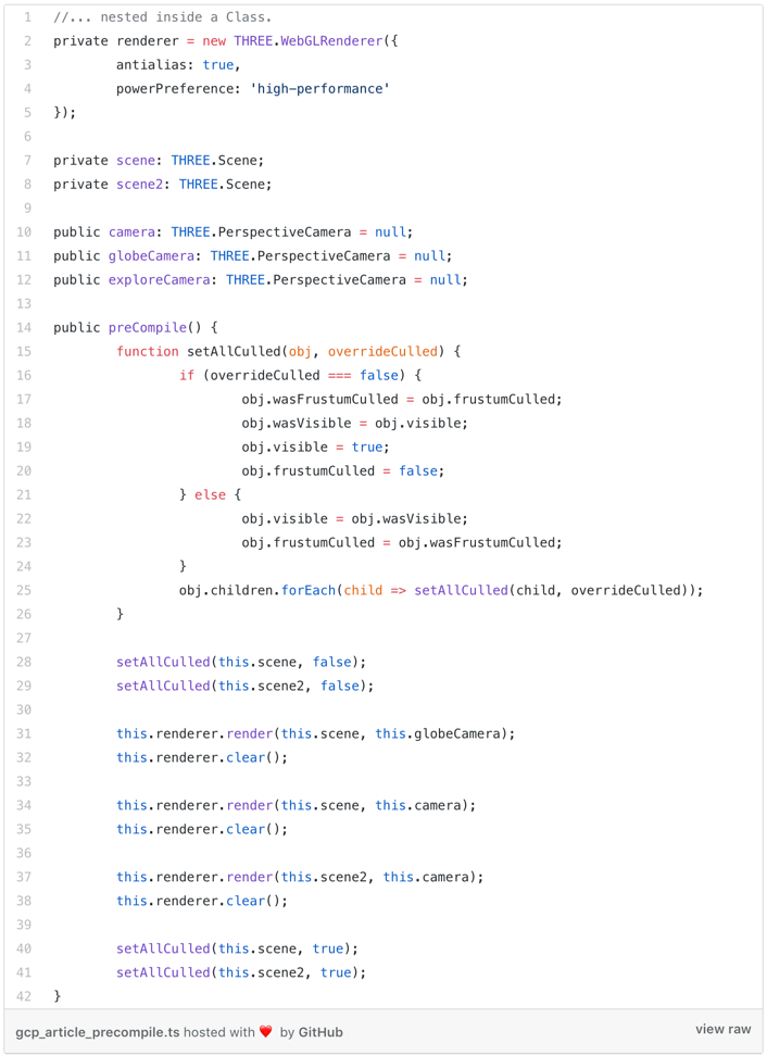 This is one of the areas we’d like to explore more, but for this project we opted to try and mitigate some of the runtime overhead by pre-uploading all textures and precompiling all materials (shaders) needed for the entire site on initial site-load. At a high level this basically means that we tried to make the cameras see all the different scenes at load by making everything visible, forcing a render once and then resetting everything to their original visibility: