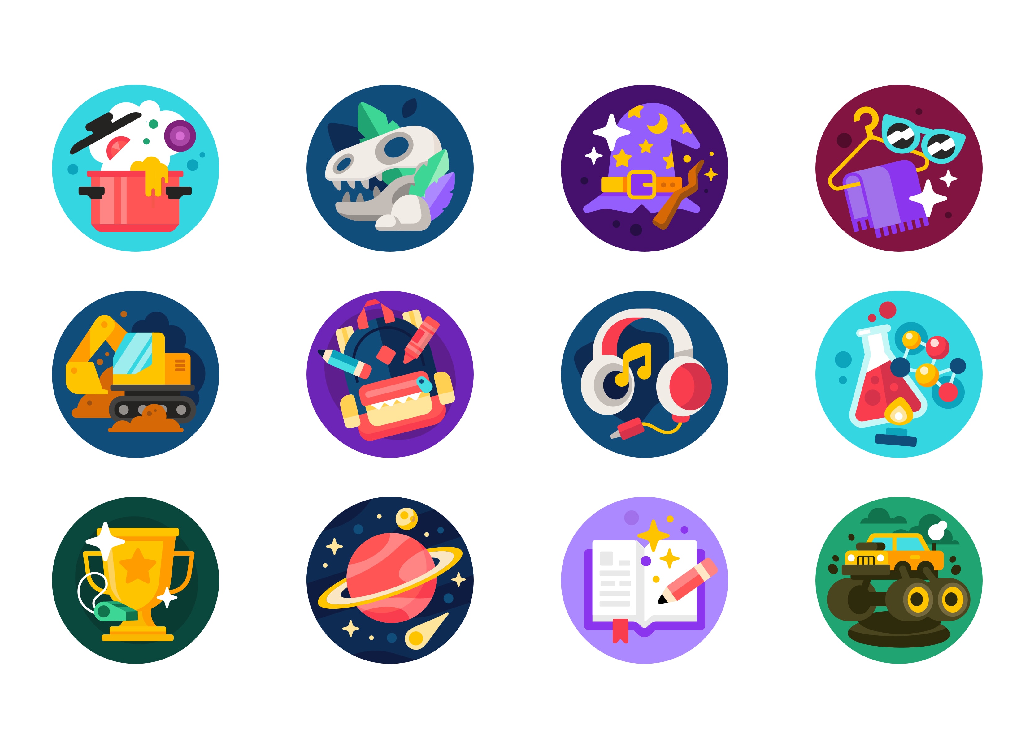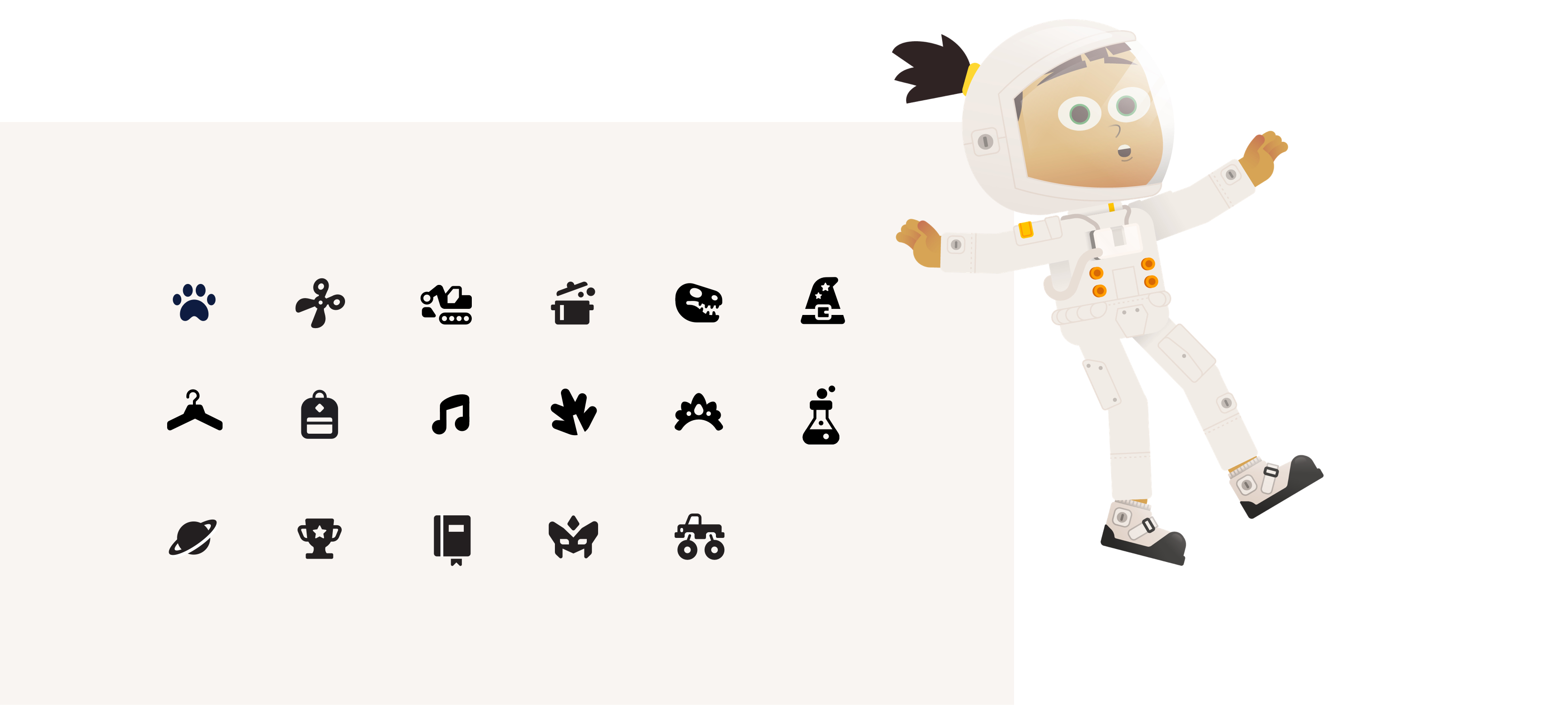 Interest icons used in onboarding allow kids to filter content for a more tailored experience.