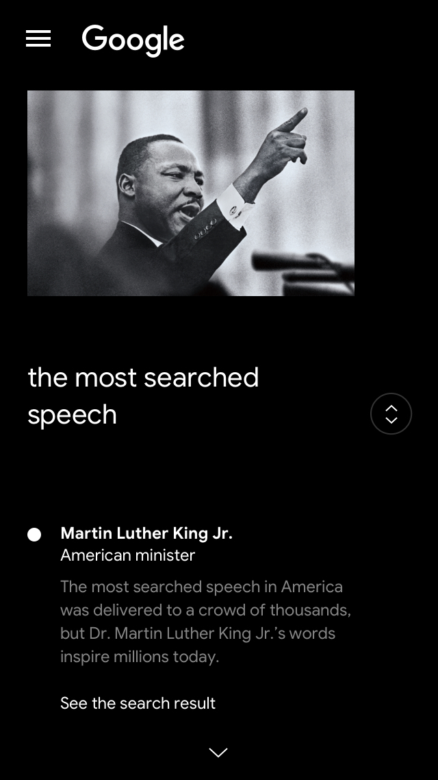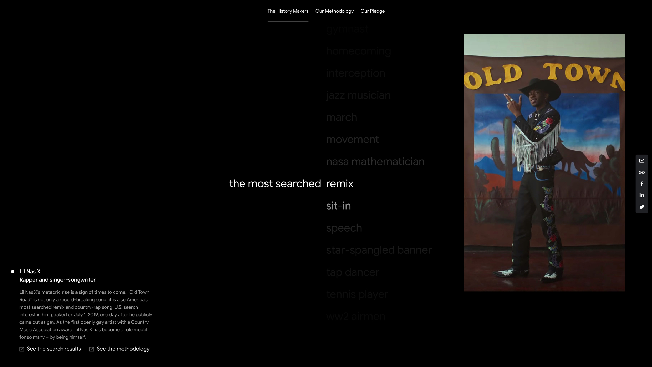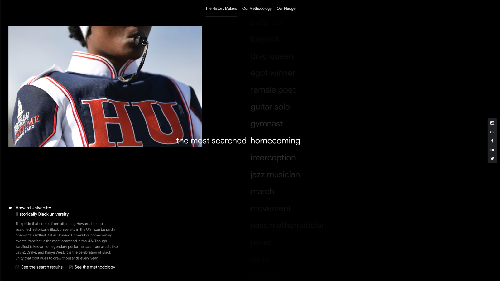 As part of this campaign, Google Brand Studio tapped Hello Monday to create a unique digital experience that would bring Black History Month to life through the lens of Search. We designed a layered experience that allowed us to showcase the most searched icons and moments according to Google’s U.S.-based Trends Data, while also highlighting Google’s support for the next generation of history makers. This experience chronicles a data-driven story that was years in the making.