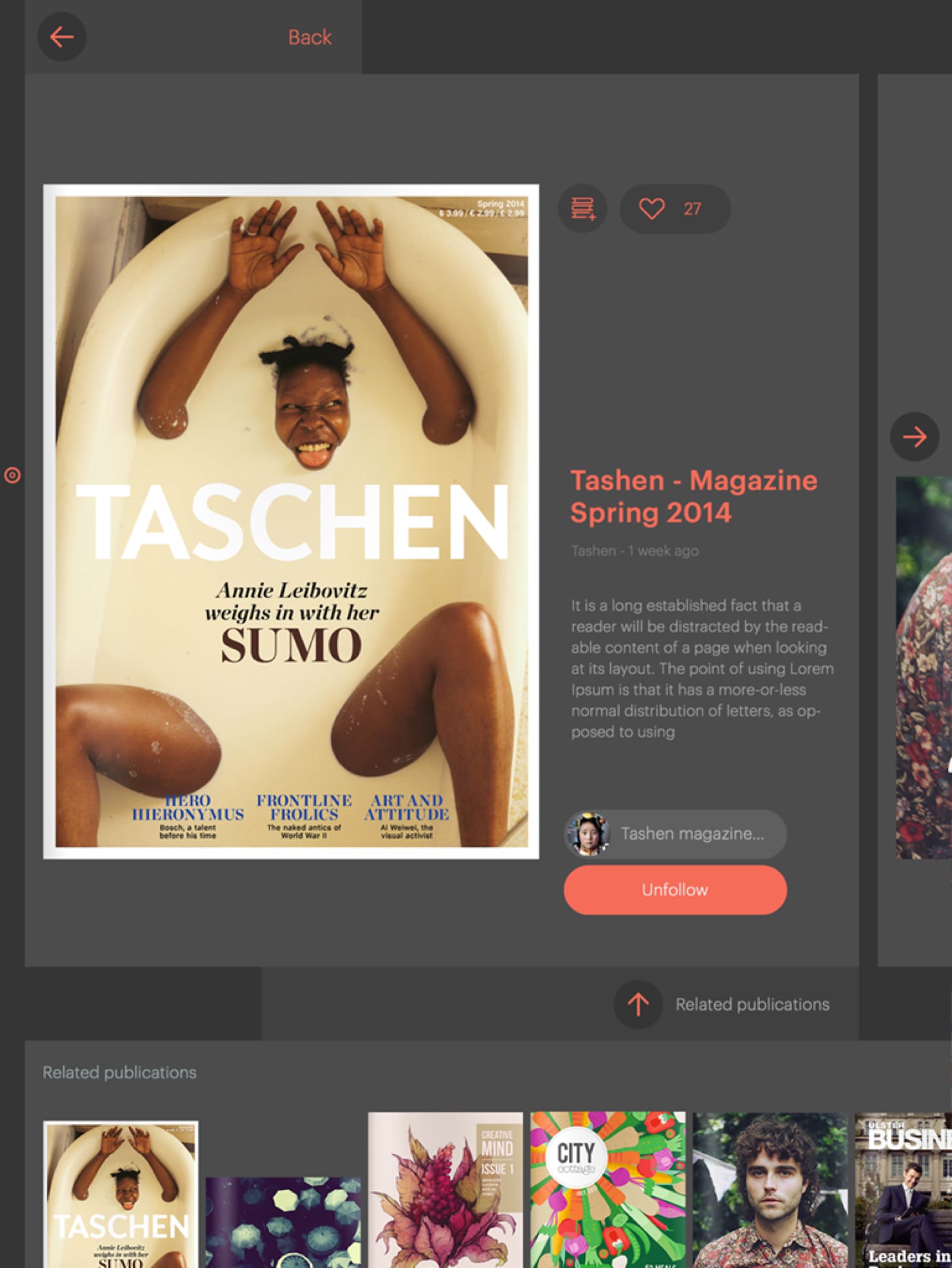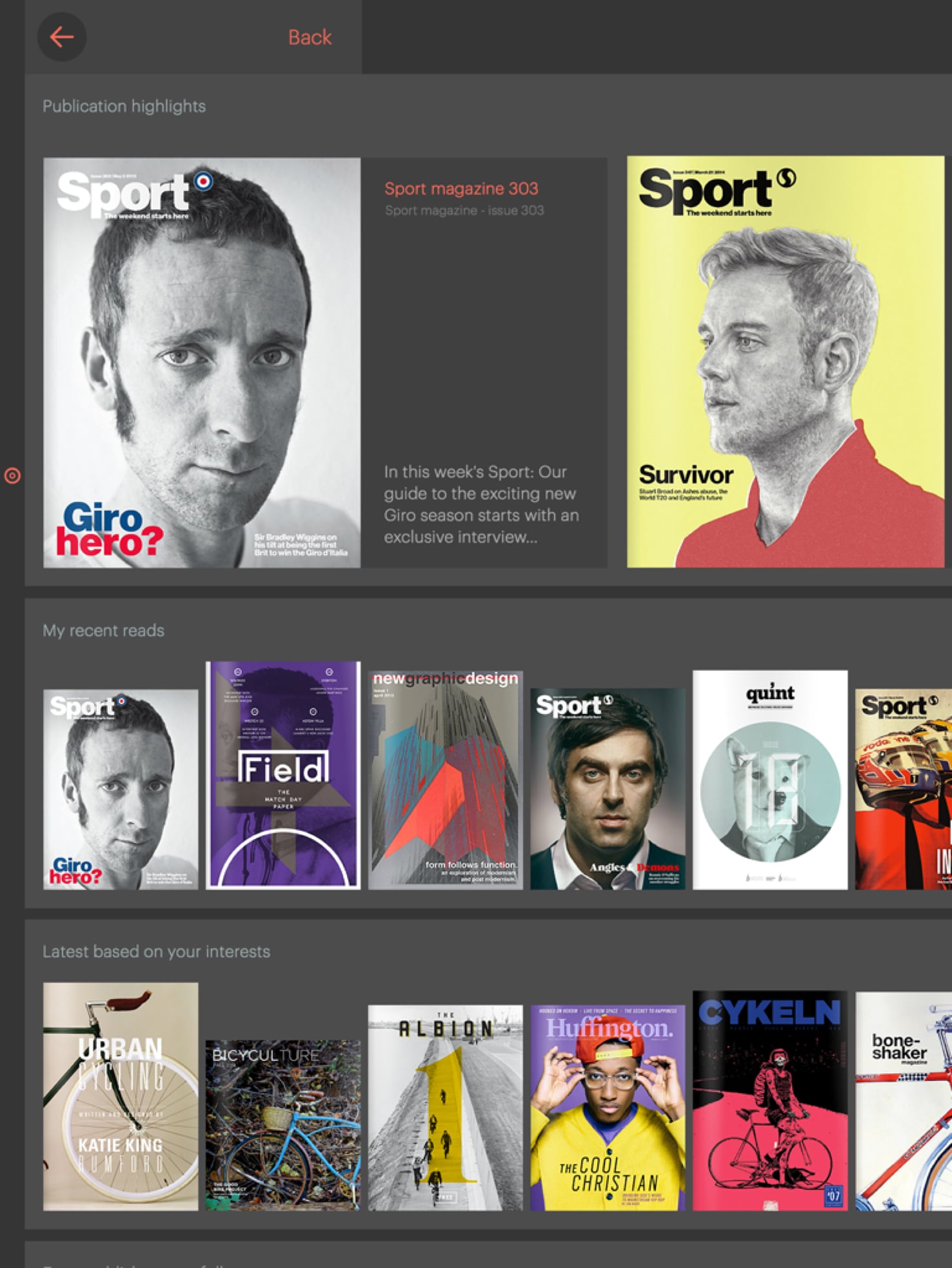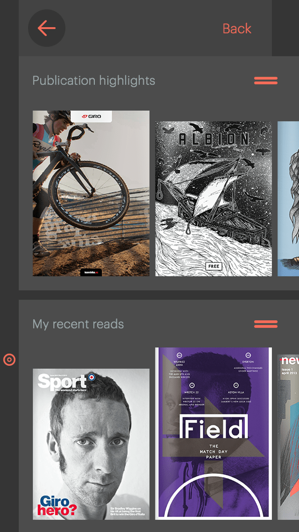 To ensure an easy overview of the endless amount of reading options on Issuu we were inspired by the physical magazine rack to present the content for the users.