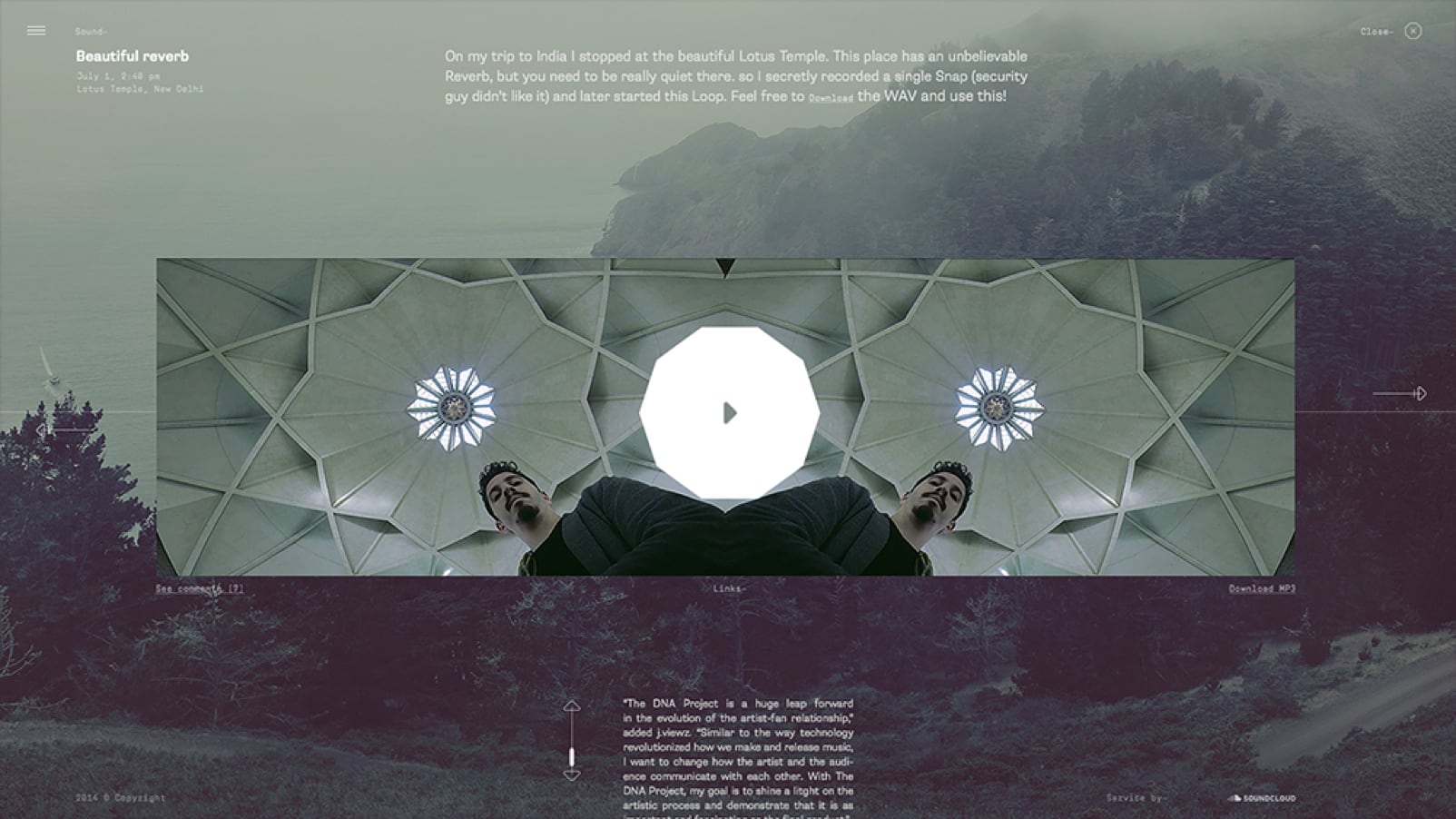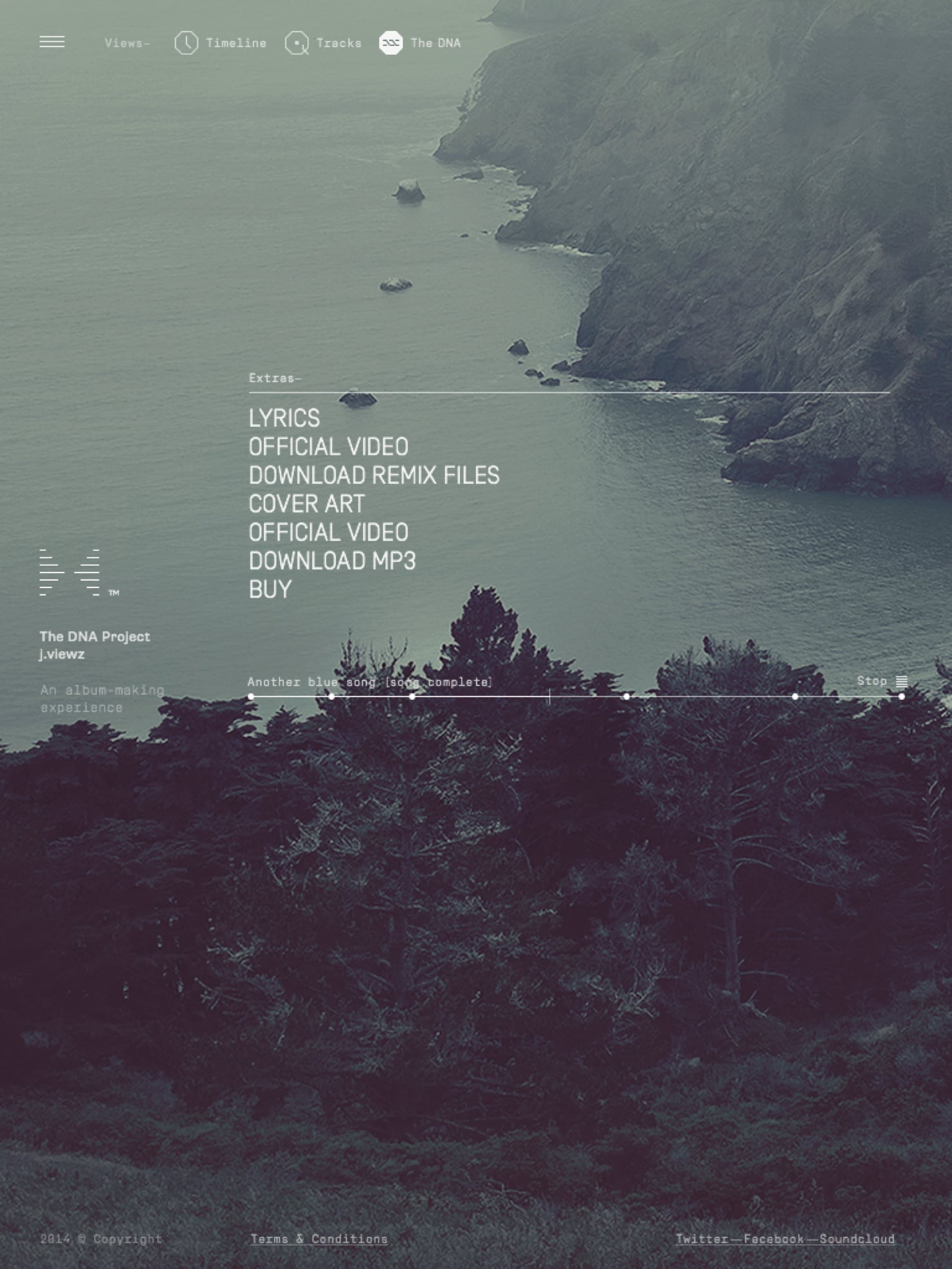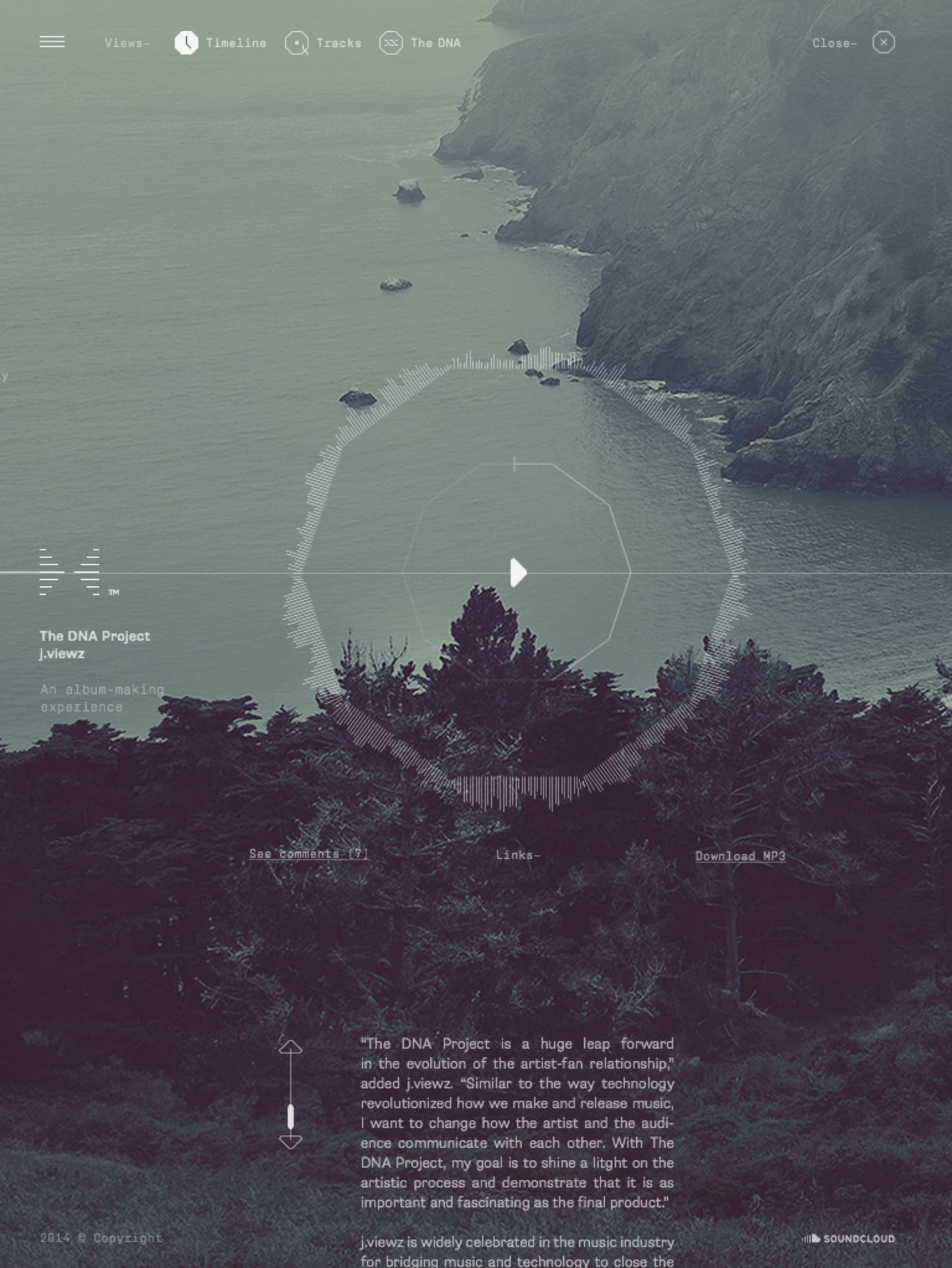 With the DNA Project, we helped J.Views open up the creative process of making an album in its entirety, providing access to the people, places, and sounds that inspired each song. Over a 10 month timeline J.Viewz created a new song every month. And through the DNA project website users were able to follow along, access and examine individual pieces that would go into a song and even contribute by uploading sound files and ultimately have their own creative influence on the songs as they took form.