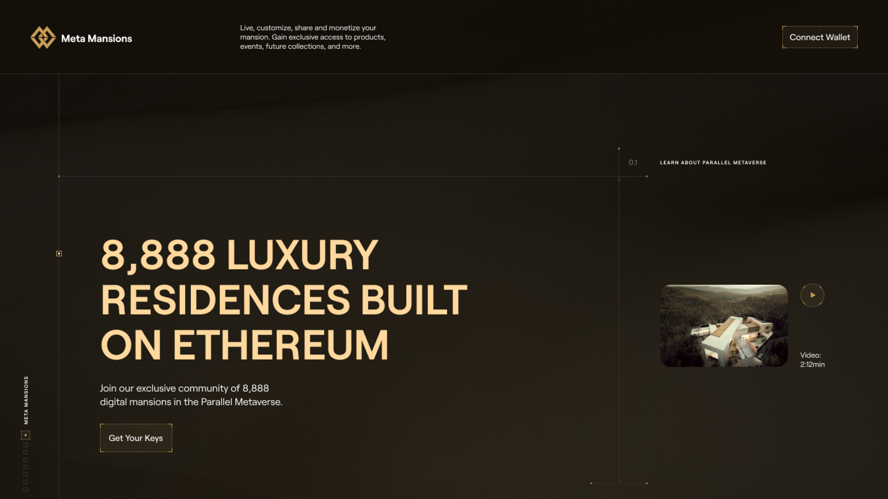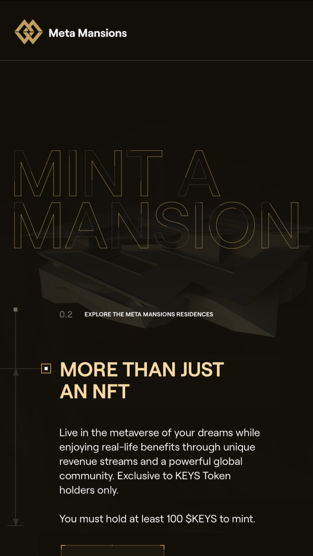 To announce the drop of 8,888 luxury digital mansions in the KEYS Metaverse, we collaborated with their team to create a premium Meta Mansions teaser website. Inspired by the company’s existing brand marks, we created a flexible digital identity designed to showcase new or existing products, events, or NFT collections. Entering the site, users are transported through a sea of pixels — an animation a combination of constructed, and then deconstructed brand logos — into a 3D render of a digital residence. The render, though subtle, comes to life on scroll. Borrowing from actual architectural drawings, the website UI design applies clean lines and unique graphic elements to put the focus on the striking design of the Meta Mansions where users can realize their dreams. Regardless of age, race or socioeconomic status, KEYS community members can live, work, interact and socialize in a world they’ve built.