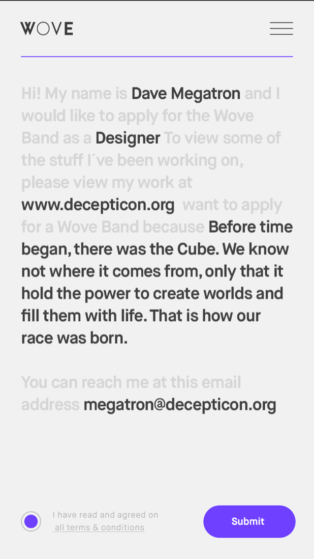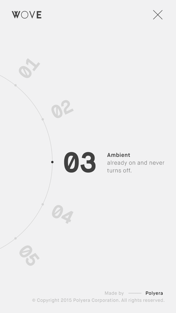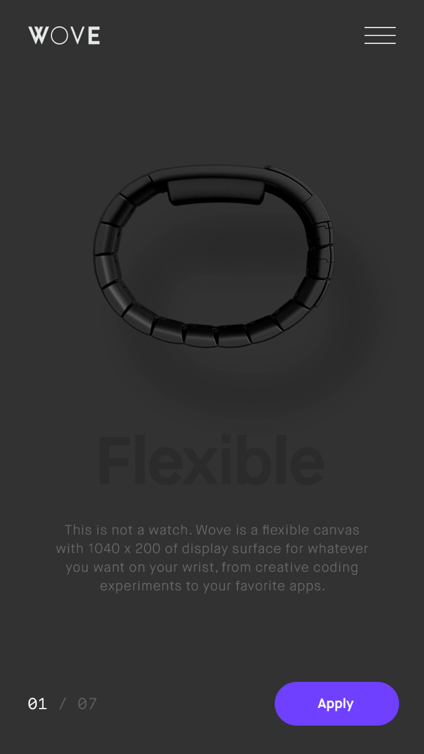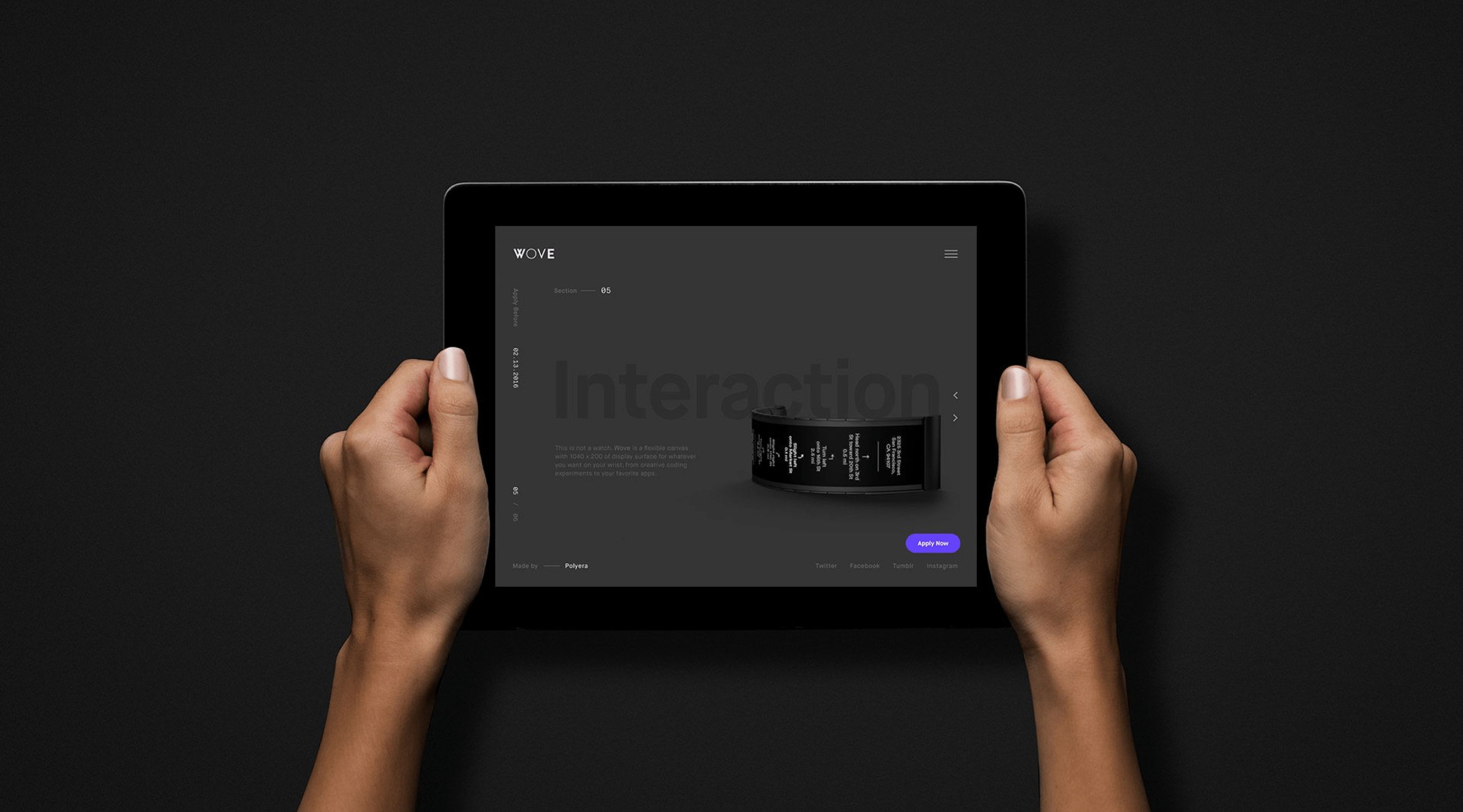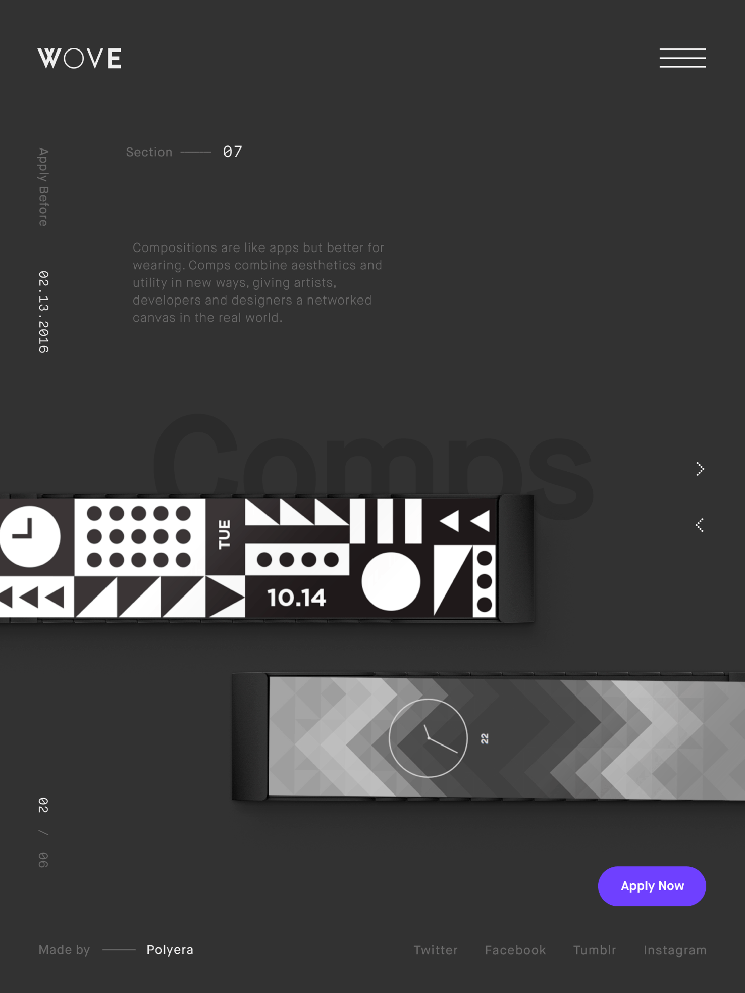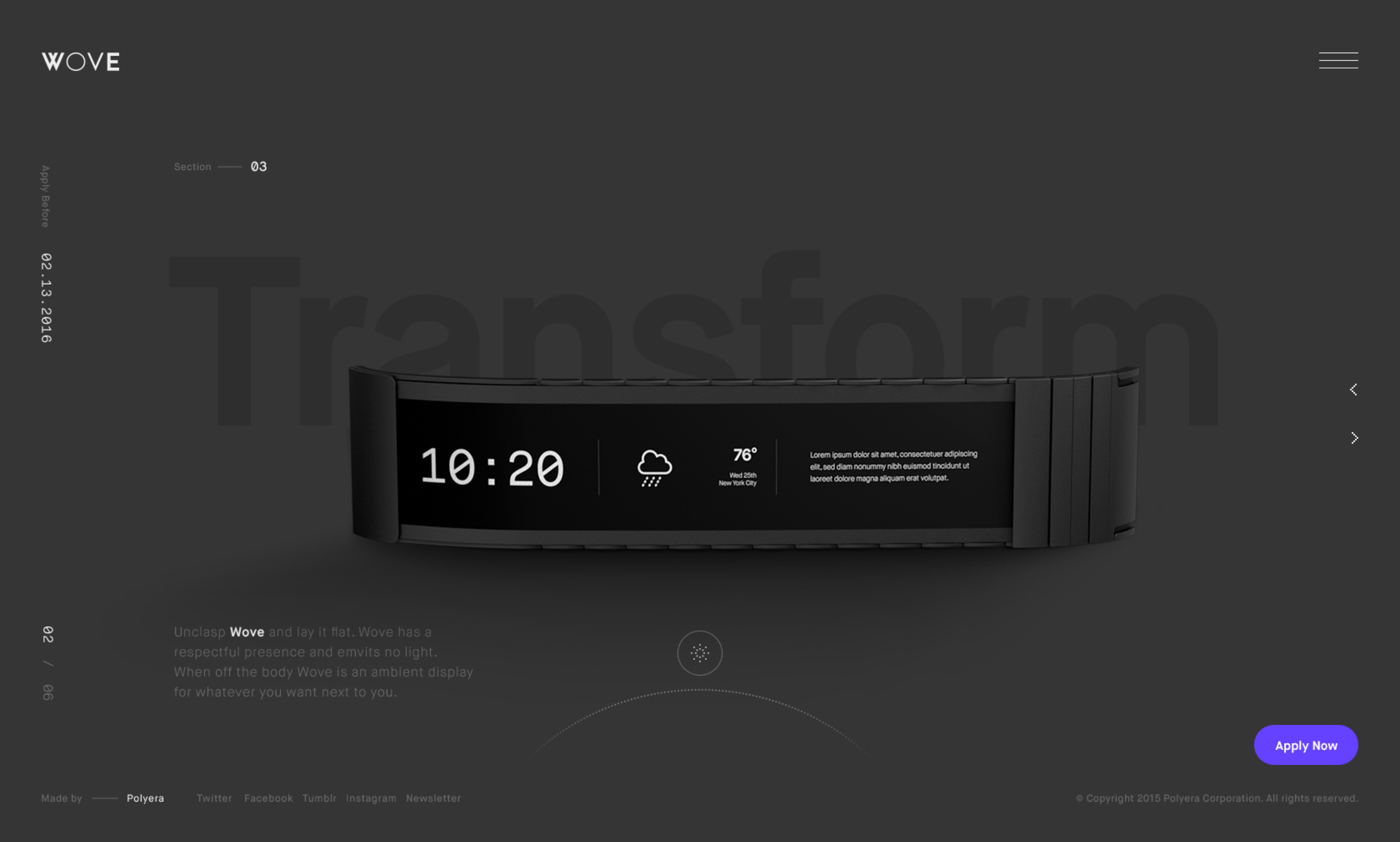 We released a teaser site and followed up with a full experience a few months later to show off the features of the band and allow creatives (developers, artists, designers) to apply for the first Wove prototypes. Much like the Kindle display, the band uses e-ink, which only shows 16 shades of grey. This helped guide our design principles which we established as simple, greyscale and nothing flashy. To convey the physicality of band, showing how it can bend, twist and turn, we created renderings of the device based on Polyera’s working 3D models.
