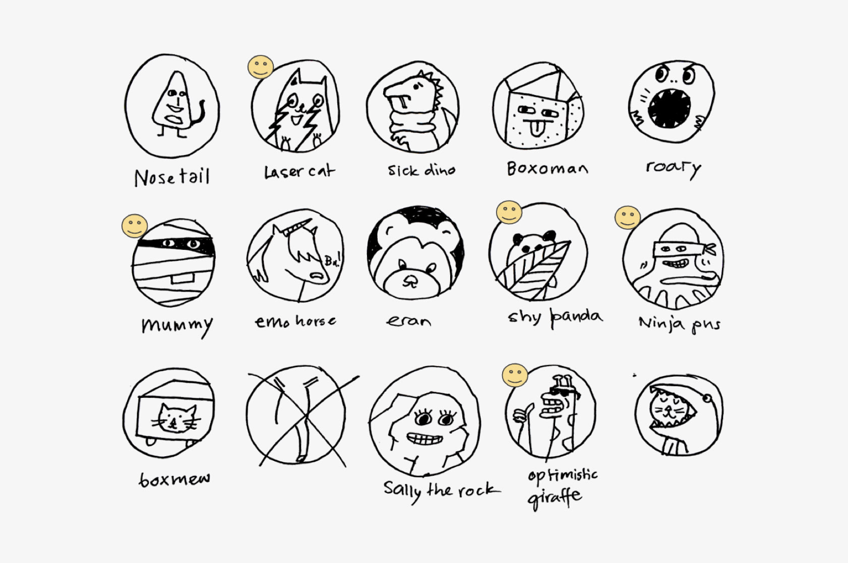 The first step to developing the universe was to push the boundaries for how weird and wonderful the characters could be. We shared and swapped our ideas by going old school with pen to paper.
