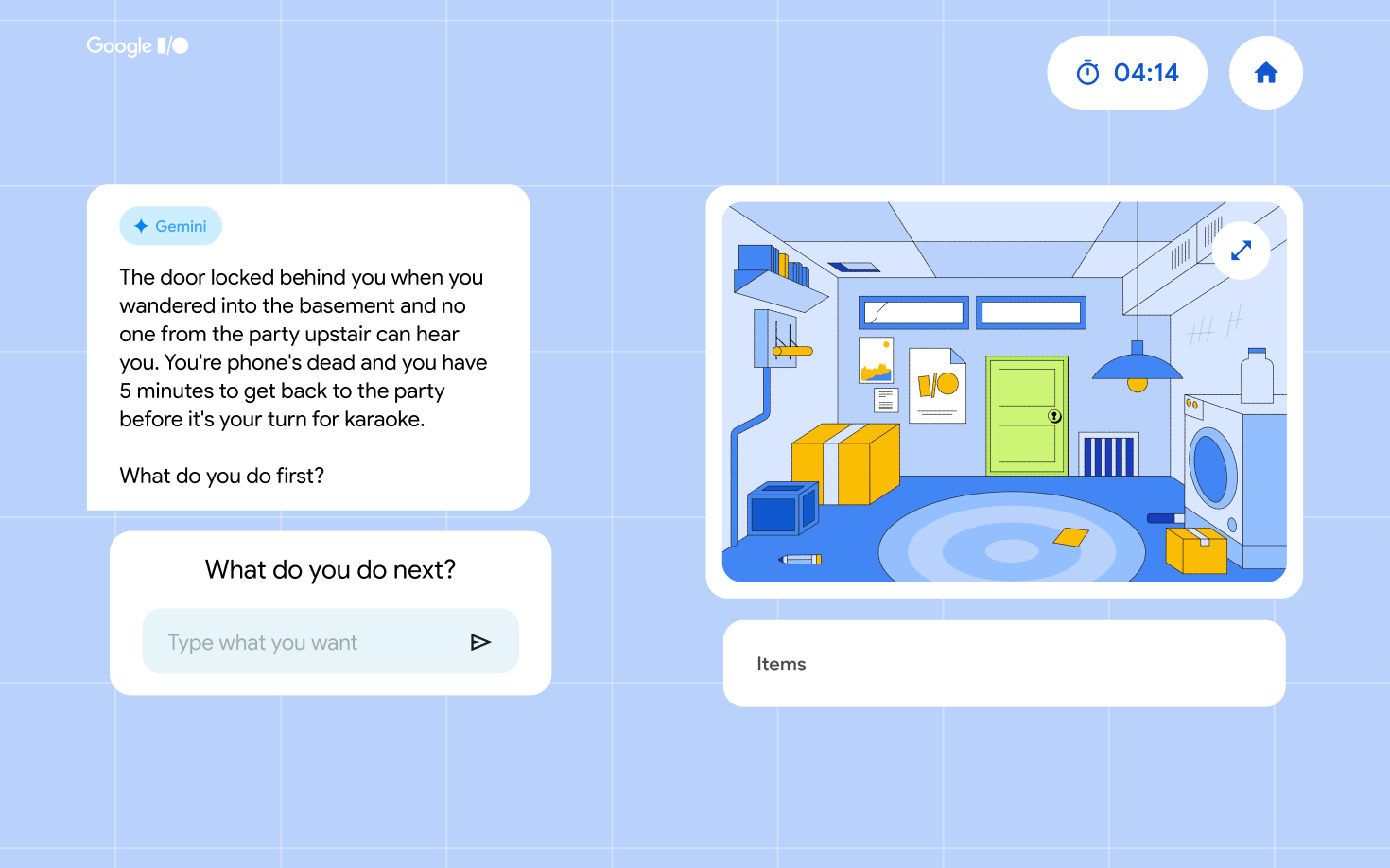 Think you've got the brains to escape? Gemini becomes your partner in crime-solving in our Escape Room app. Choose your room, chat with Gemini to search for clues, and piece together the puzzle. It's a race against time as you orchestrate your grand escape! Try it here!