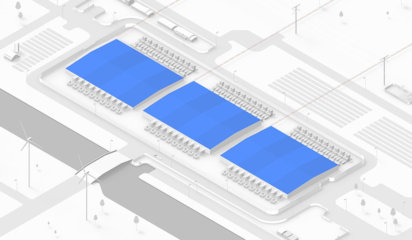 The second scale level was Region. We made this using as many references from public images of the different Google data centers around the world. The main purpose of this level was to depict examples of important exterior elements that some Google data centers have, like cooling towers or electricity generators. We also wanted to show how a Google Data center could make smart and respectful use of the environment including electric windmills and farms near the centers.