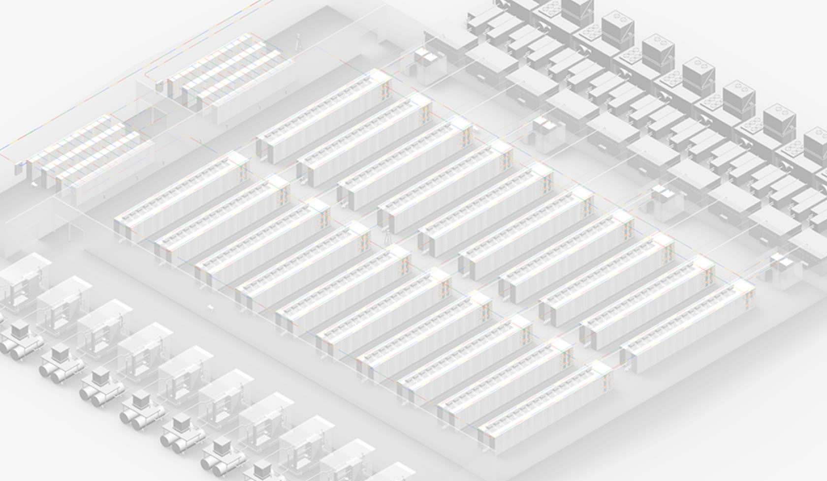 We switched to a front server cluster view in the fourth level of scale in order to depict moments related with data processing. We created 2D animations that used small blinking lights as a visual metaphor for the different kinds of data bits processed and shared inside the servers.