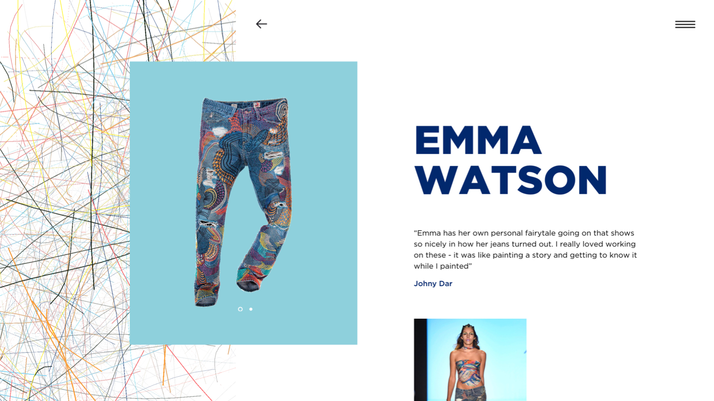 When landing on the experience the particles separate and reconnect as you scroll. This use of particles is also carried through each individual participant page with customized colors to match each pair of unique jeans.