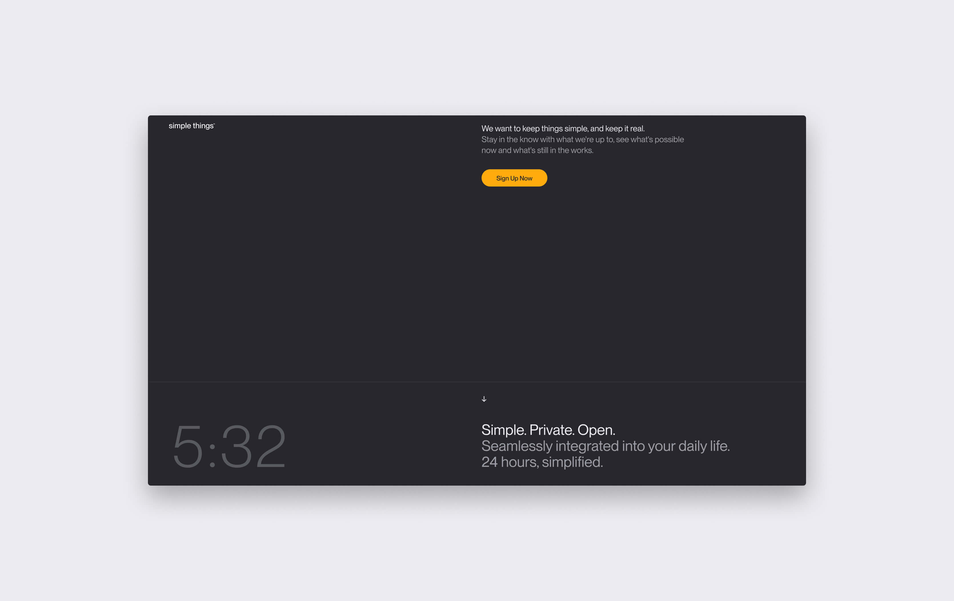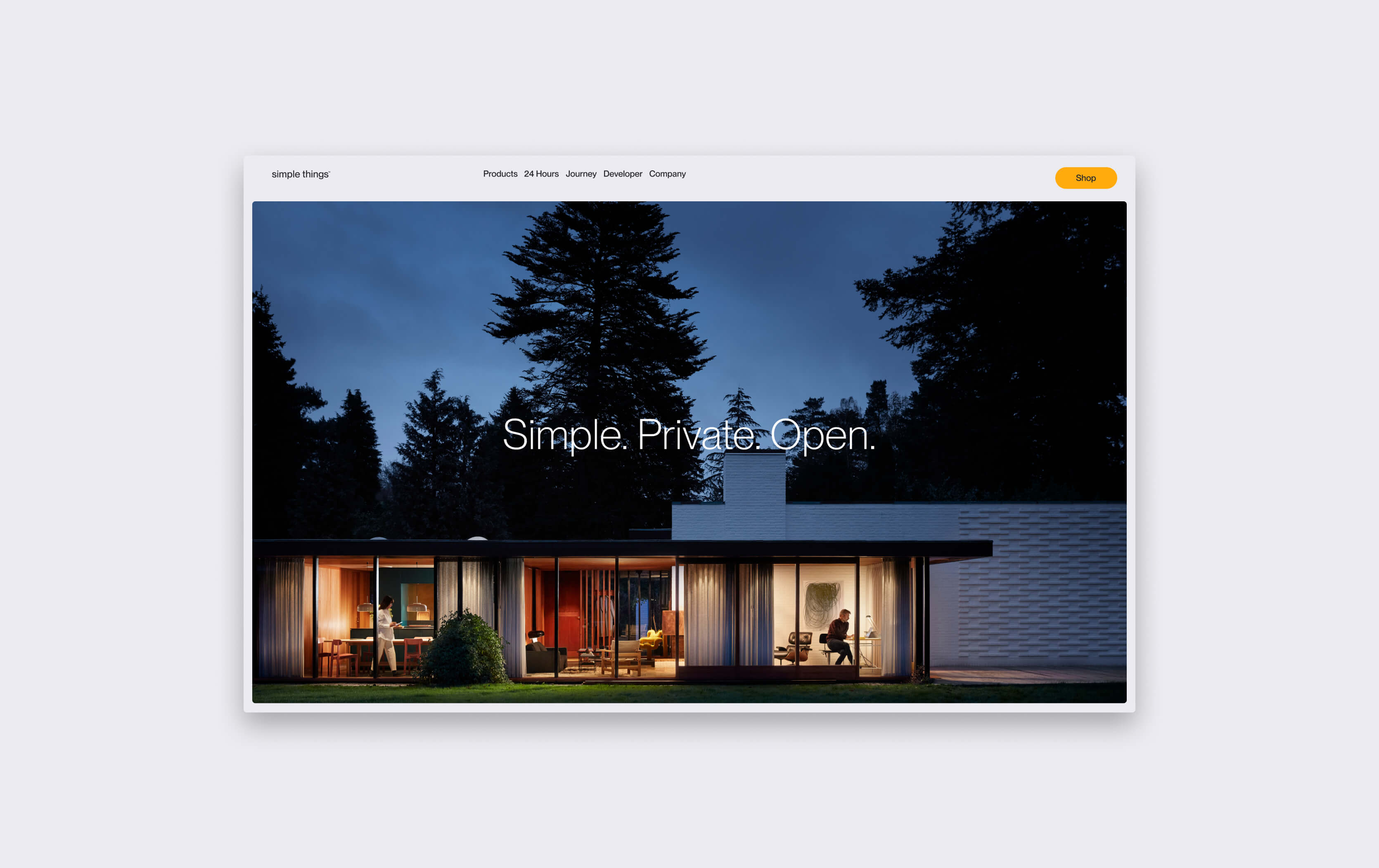 Hello Monday worked with Simple Things to launch the brand. The brand was built around three pillars. SIMPLE - inherent to the name and promise of the brand. OPEN - a system that allows you to look under the hood, and customise it to your own needs. PRIVATE - a subtlety woven throughout the branding that makes it feel non-invasive wherever it is present, including the logo, font choices and simple color palette.