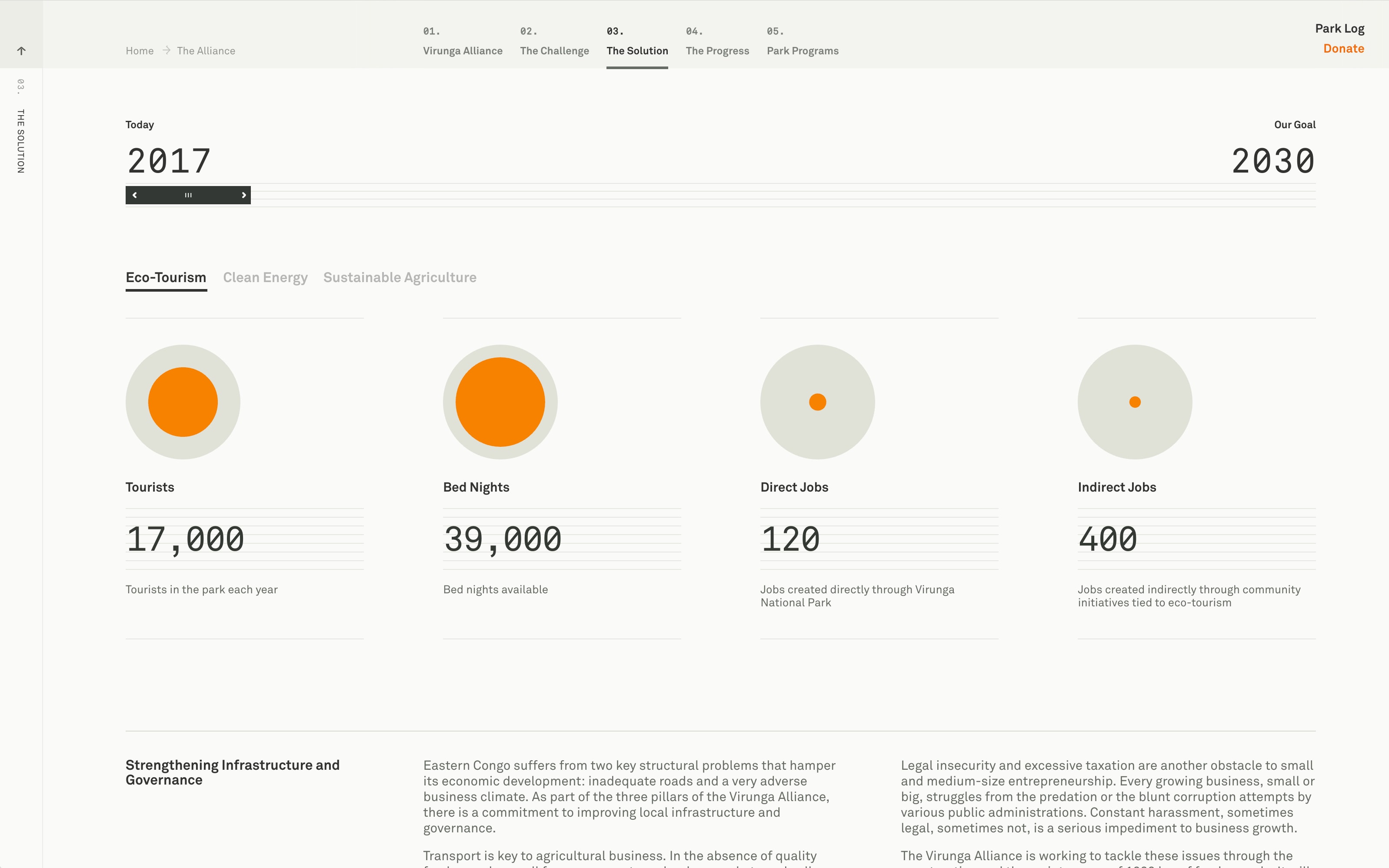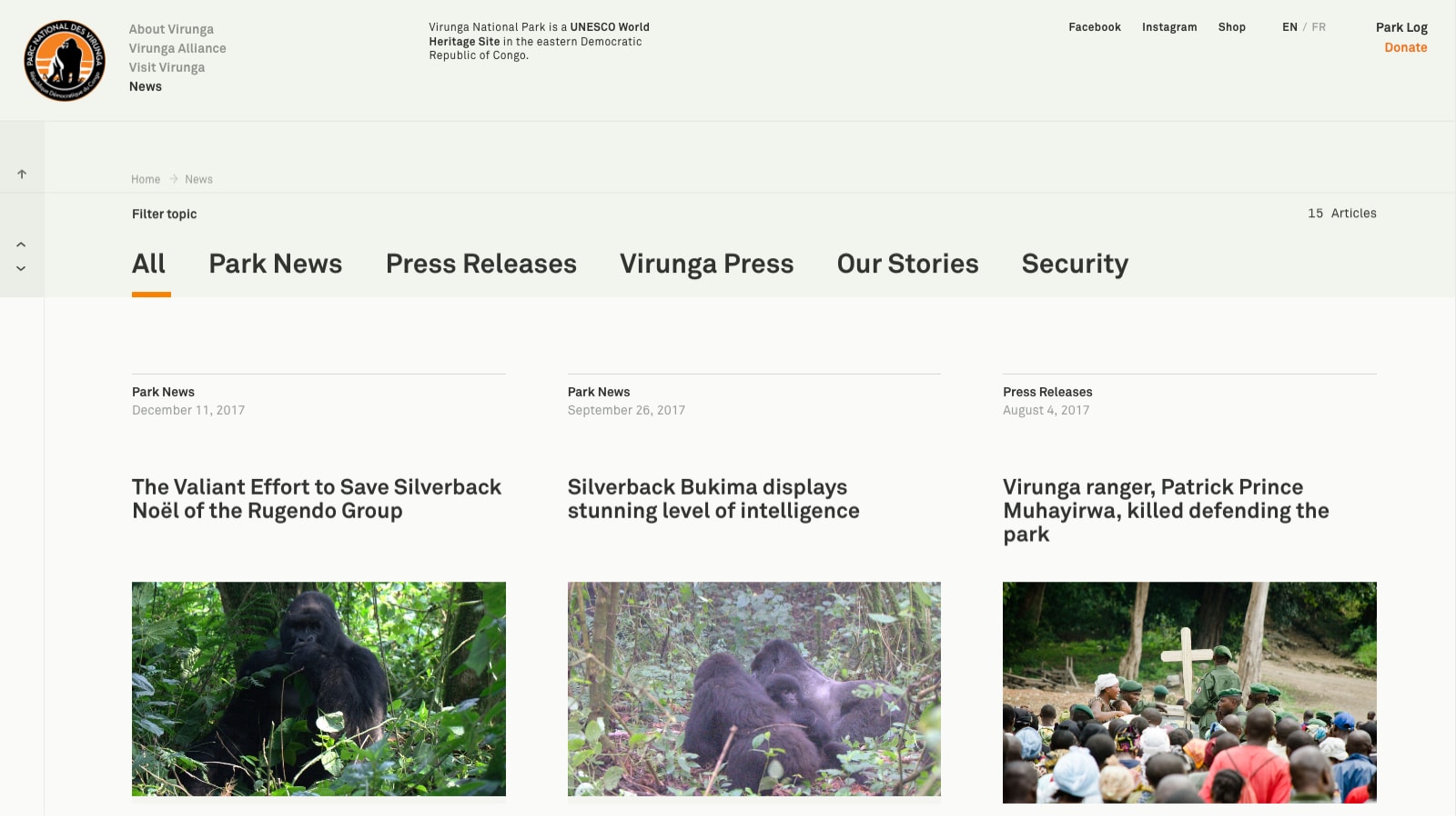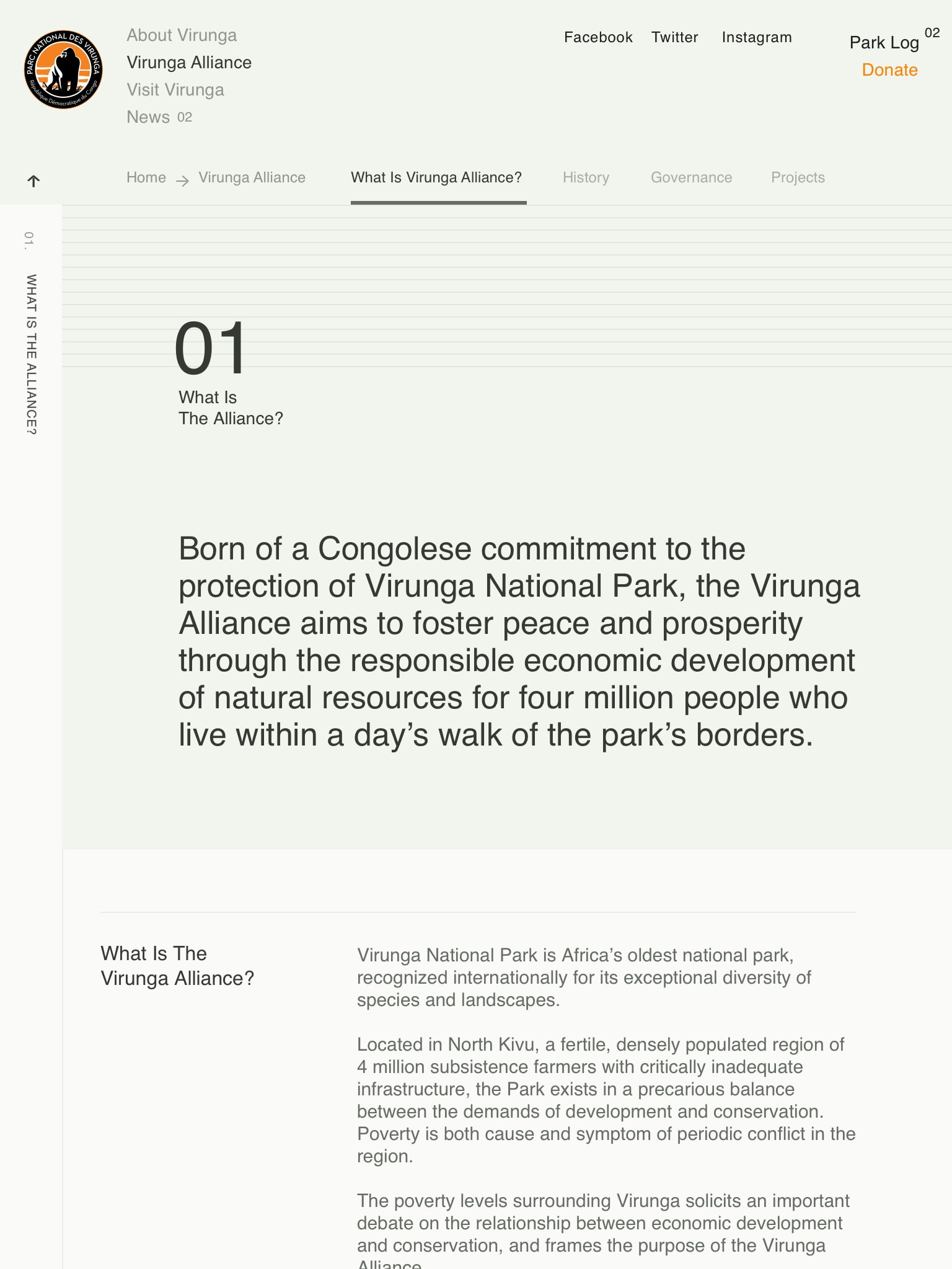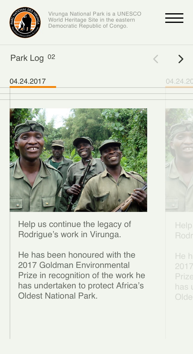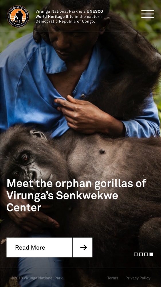 Virunga National Park is an ecological treasure. Its vast mountains and gleaming lakes represent a source of pride, hope and livelihood for millions of Congolese people. We redesigned their website to galvanize support from potential donors while educating users and encouraging tourism to the park.